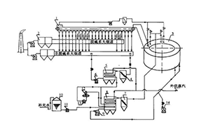 1—烧结机; 2—主电除尘器; 3—环冷机; 4—主扫除尘器; 5—主排余热锅炉;6—主排引风机; 7—环冷除尘器;8—环冷余热锅炉; 9—环冷引风机; 10—储水箱;11—增补水泵; 12—除氧器; 13—锅炉给水泵; 14—备用风机